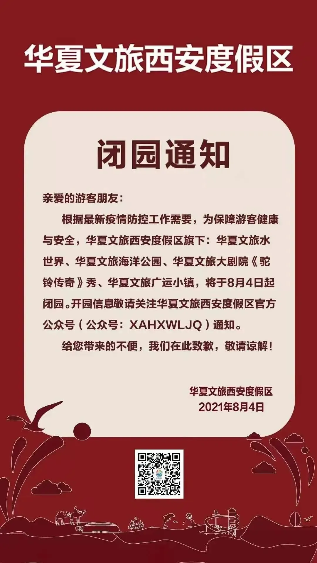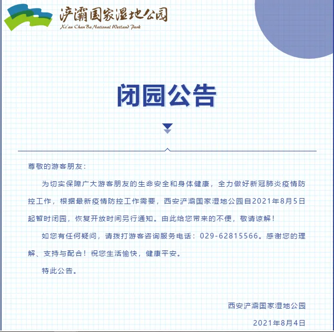 根据最新疫情防控工作需要,西安浐灞国家湿地公园自2021年8月5日起暂时闭园,恢复开放时间另行通知。