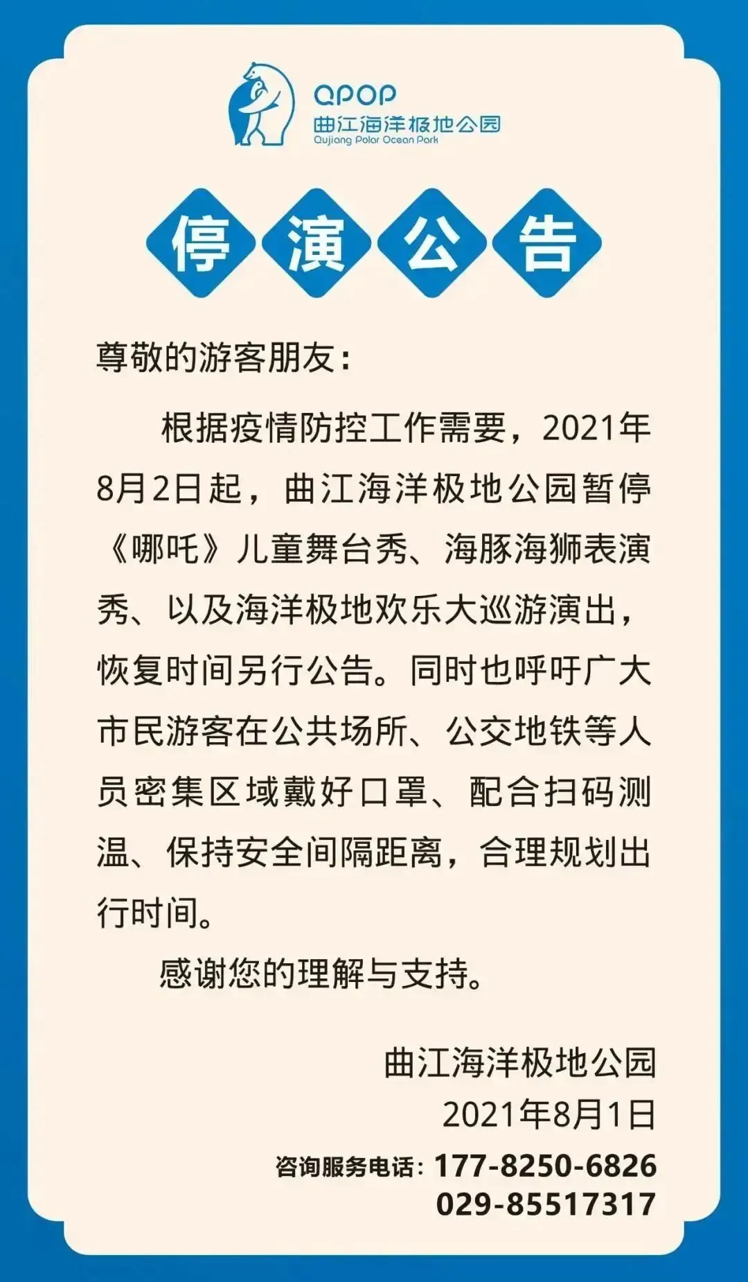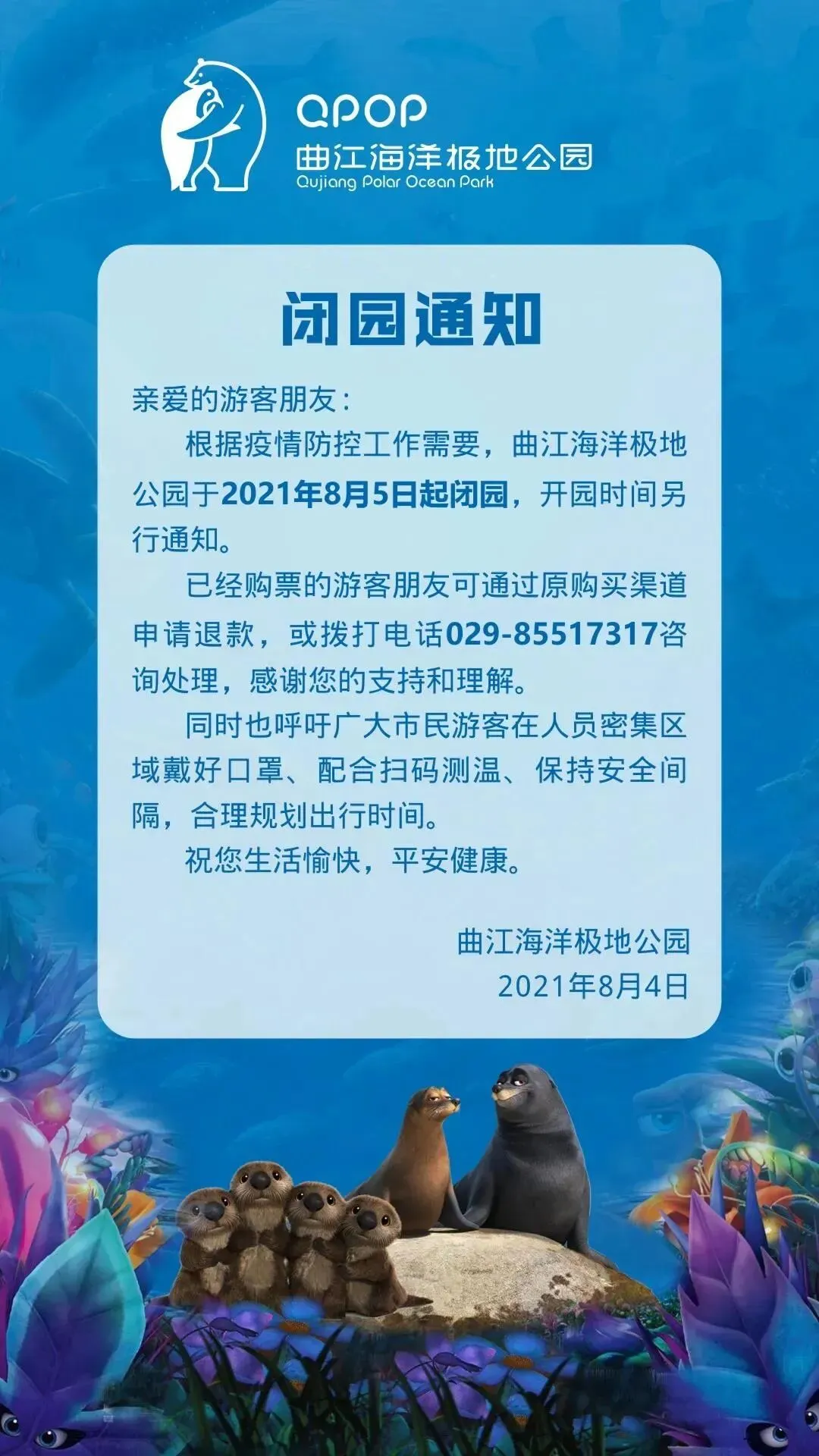 根据疫情防控工作需要,曲江海洋极地公园于2021年8月5日起闭园,开园时间另行通知。