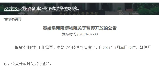 自2021年7月30日12时起秦始皇帝陵博物院暂停开放,恢复开放时间另行通知。
