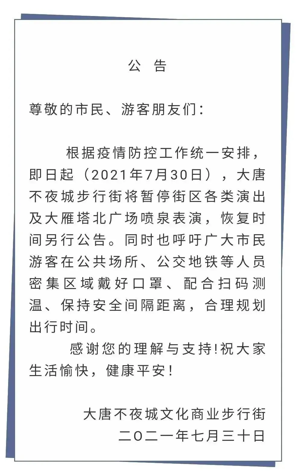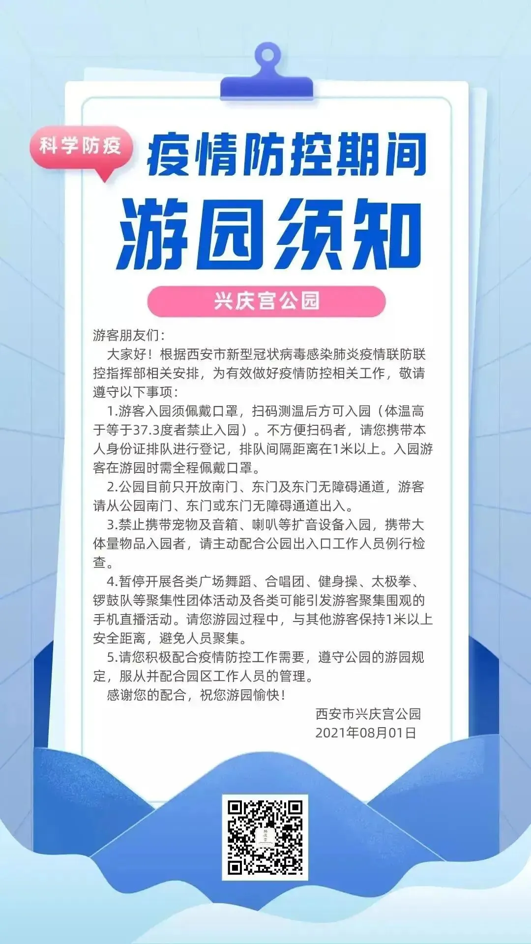 兴庆宫公园暂停开展各类广场舞蹈、合唱团、健身操、太极拳、锣鼓队等聚集性团体活动及各类可能引发游客聚集性围观的手机直播活动。