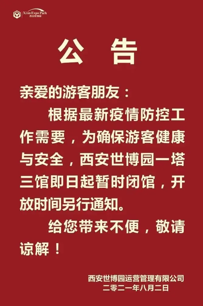 8月2日起,西安世博园一塔三馆暂时闭馆。