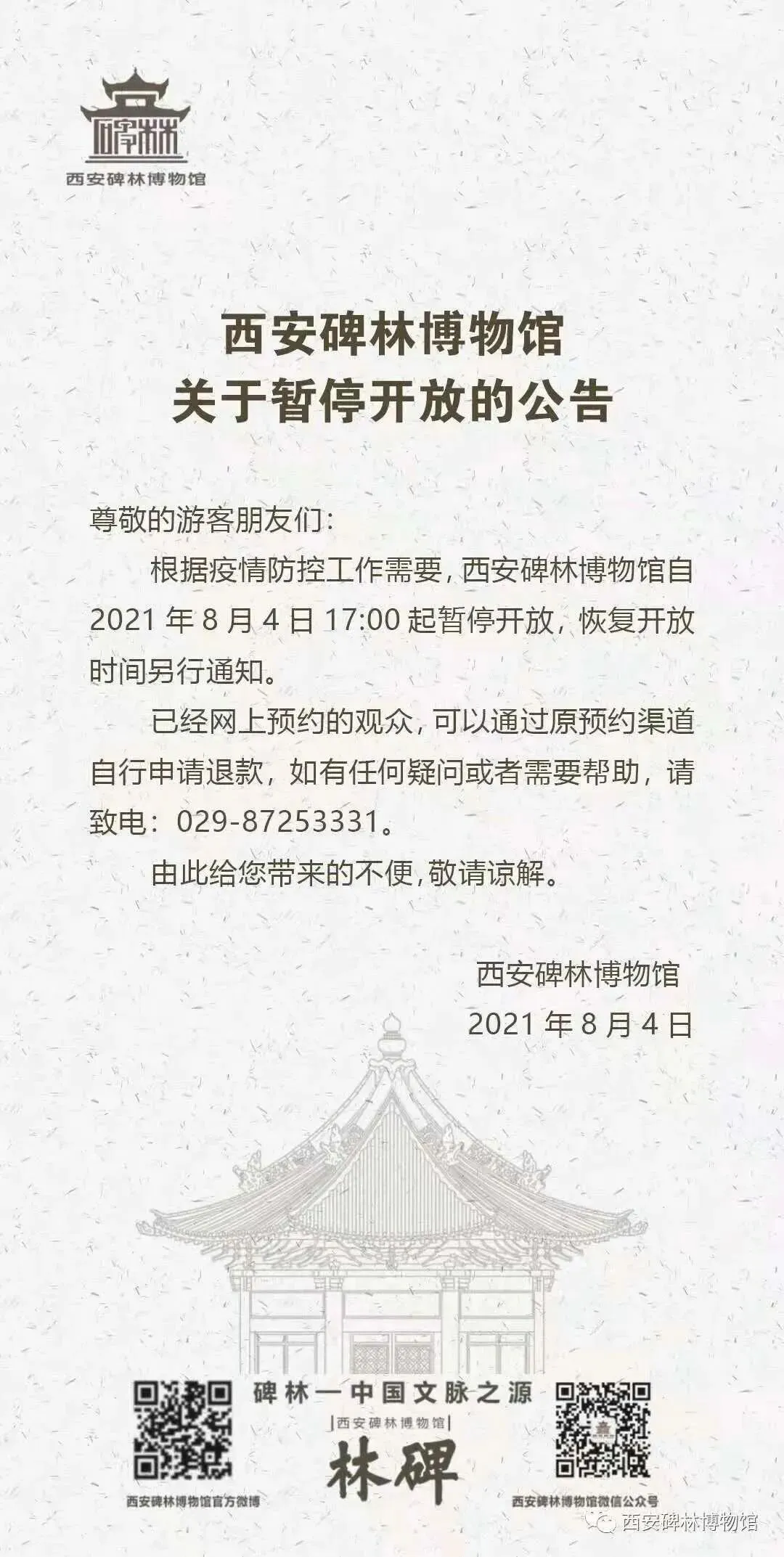 西安碑林博物馆自2021年8月4日17:00起暂停开放。