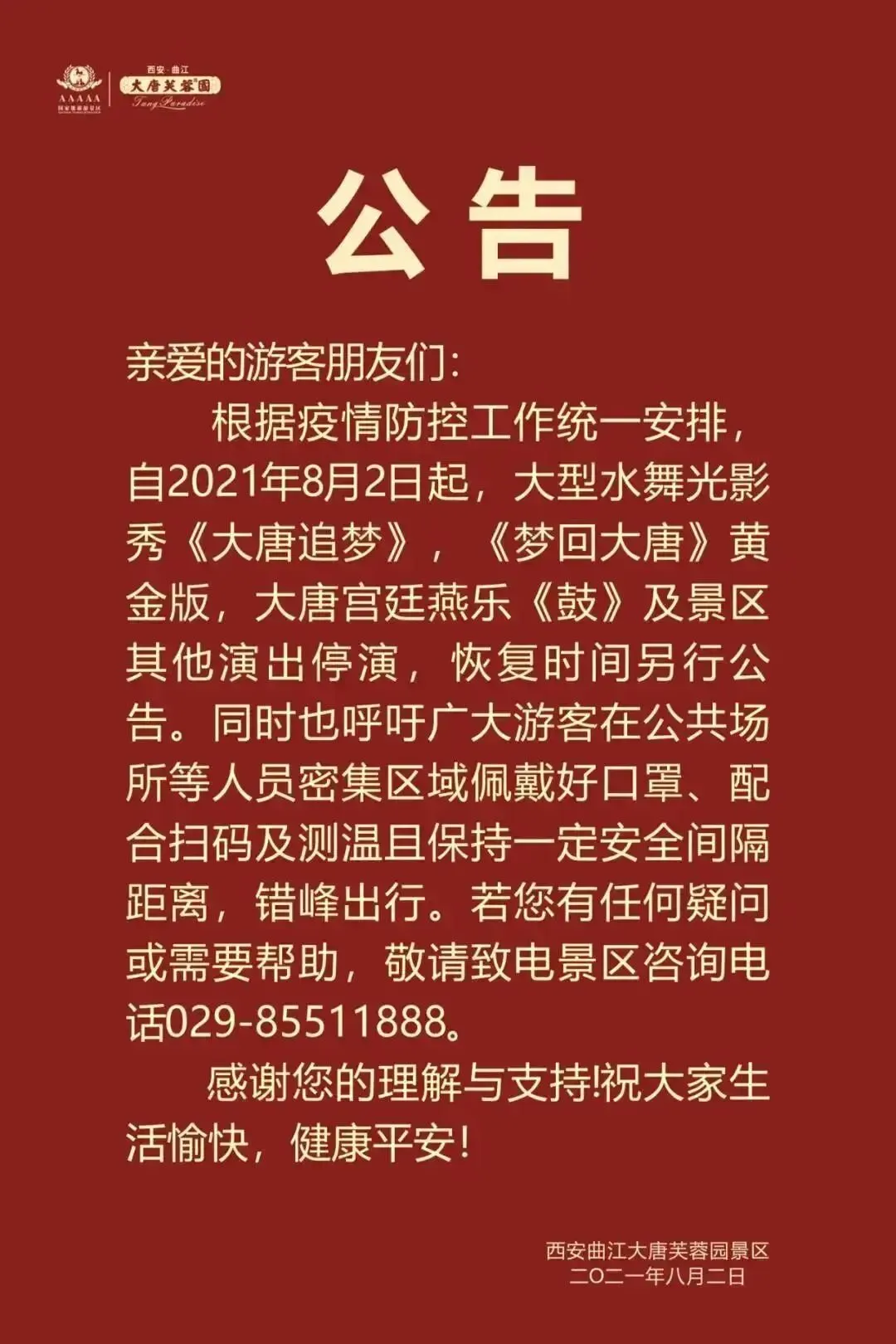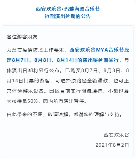 截至日前(据不完全统计),华清宫景区《长恨歌》《12·12》、大唐芙蓉园景区《大唐追梦》《鼓》《梦回大唐》黄金版、西安唐乐宫《大唐女皇》、华夏文旅大剧院《驼铃传奇》、西安城墙景区《梦长安-大唐迎宾盛礼》、曲江海洋极地公园《哪吒》儿童舞台秀、海豚海狮表演秀、海洋极地欢乐大巡游、乐华城·秦汉园《秦汉·风云》、昆明池·七夕公园《汉武雄风》、大唐不夜城街区各类演出、大雁塔北广场喷泉表演、诗经里风雅诗颂馆演出、赵公明文化景区相关舞台演出、西安欢乐谷·玛雅海滩音乐节等演出延期,具体恢复时间以景区公告为主。