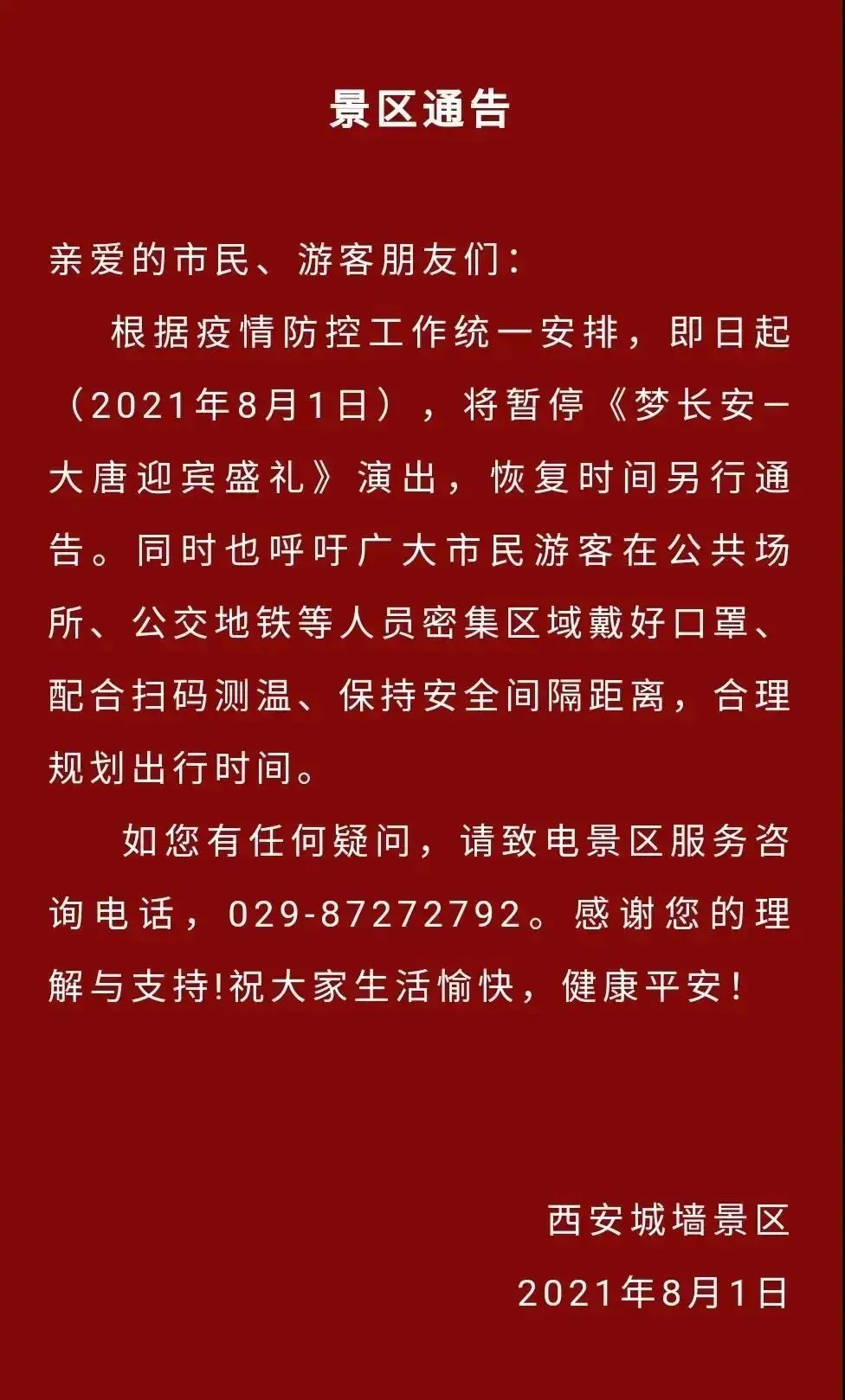 为切实保障广大游客的健康和安全,西安部分景区旅游演艺项目暂时停演,部分演出延期。