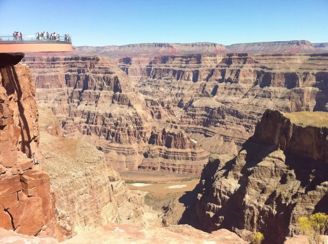 导游带着一行人抵达峡谷Eagle Point,讲解完注意事项后,让大家自由拍照、观赏。这里人们最喜欢的大峡谷拍照地点,站在从峡谷壁伸展出来的马蹄形玻璃桥上,脚下就是悬崖,整个峡谷的景色都一览无余。