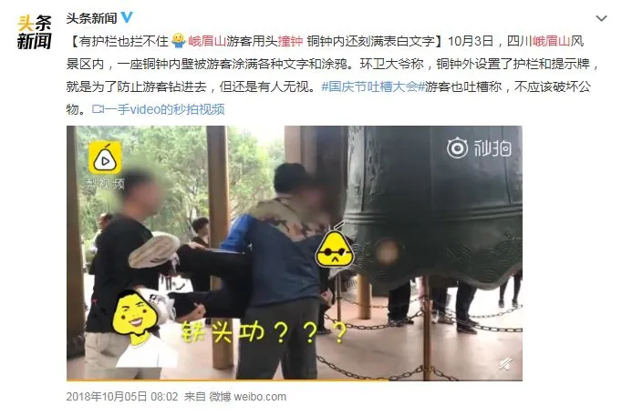 2018年十月国庆期间,峨眉山景区内,尽管有围栏和告示牌,一座铜钟还是被游客写满了文字涂鸦,还有两位游客抱起同伴,把人当作钟杵撞钟。