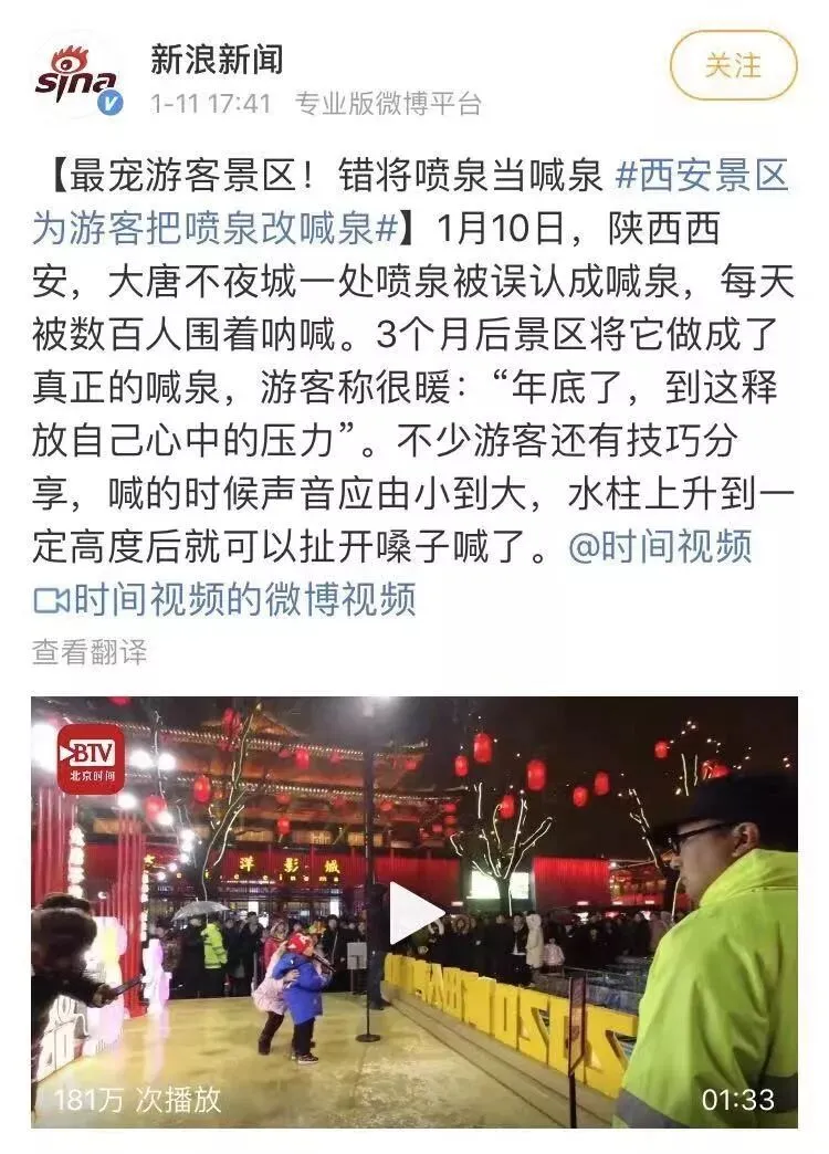最多时上百位游客围着它嗷嗷乱叫,虽然旁边的保安小哥多次提醒,这玩意儿不喊也会喷。没想到这几天,不夜城发出公告,鉴于游客的热情,他们已经把这个喷泉改造成真正的喊泉。