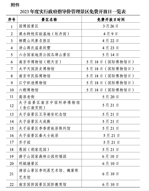 据市发改委,2023年度南京市实行政府指导价管理景区免费开放日已经公布,共涉及45家景区。其中,最早一家为园博园景区,3月26日开放。