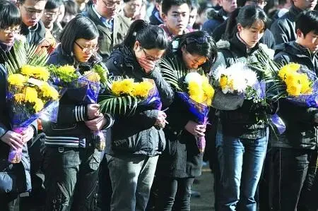2010年12月,以复旦大学学生为主的18名上海驴友组团前往黄山未开发区域探险时迷路,民警张宁海在营救行动中不幸坠崖遇难。图为参加追悼活动的学生悲痛哭泣。 新华社发