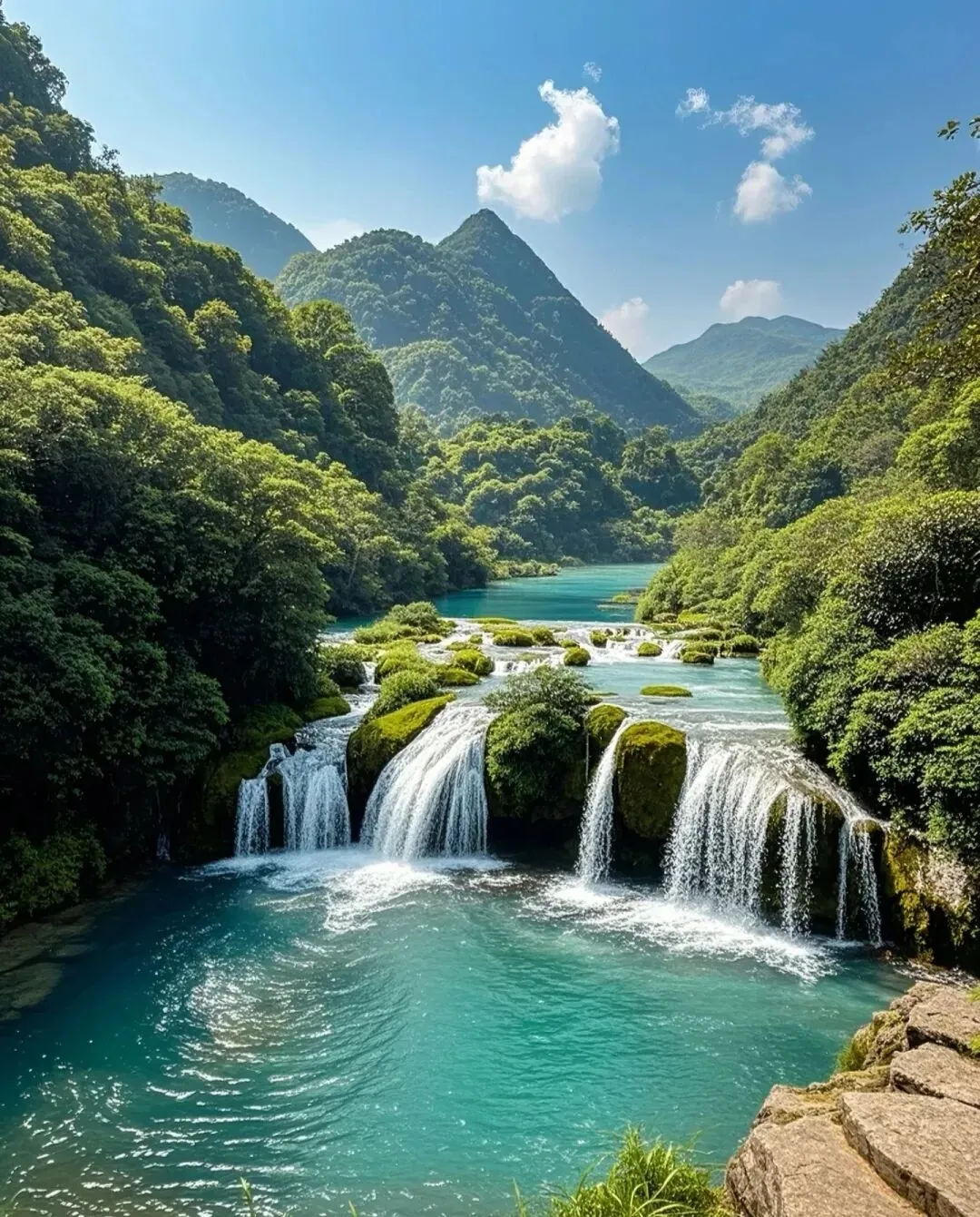 水是那种透亮的蓝绿色,像加了滤镜一样干净,