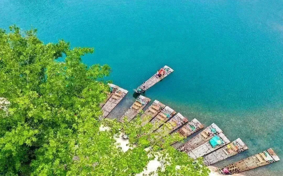 坐在竹筏上听着潺潺流水,远眺绵绵群山,感受与自然融为一体的清幽。
