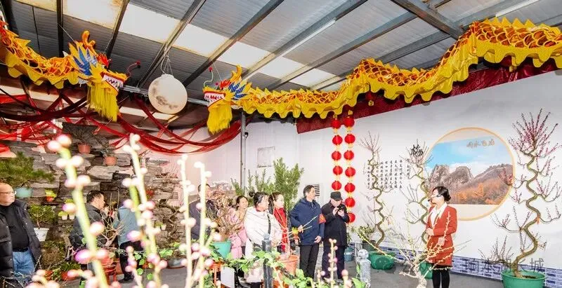 活动打造双重沉浸式体验空间:室内展区以三大文化脉络构建古风秘境,珍品梅花盆景与古梅庄藏品相映,搭配青梅煮酒、围炉煮茶等体验项目及古风演绎、NPC互动,春节“拍马屁”打卡地引爆社交传播;