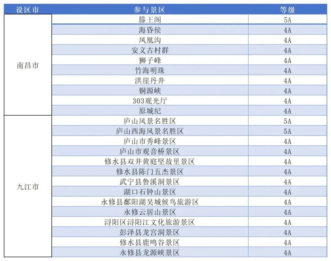 免收庐山风景区(5A级)、三叠泉、白鹿洞书院、观音桥、秀峰、碧龙潭、桃花源、石门涧景区入园门票(不含观光车、索道等景区二次消费项目)