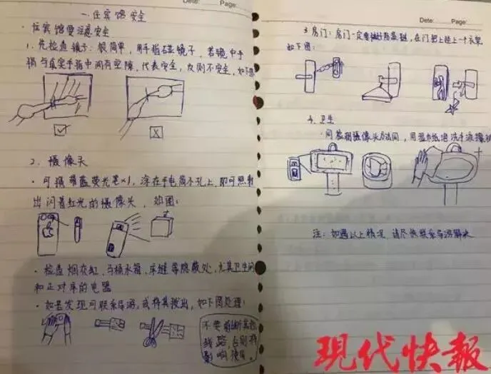 1 月 21 日,记者来到小樊的家中,看到了这本由红线穿好的、网传的旅游攻略,其内容涵盖了住宿安全、购物须知、游玩叮嘱、穿着建议、飞机安全等。