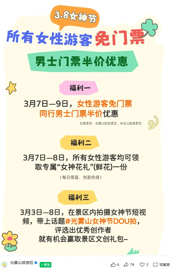福利内容:3月7日、8日,所有女性游客免门票入园。