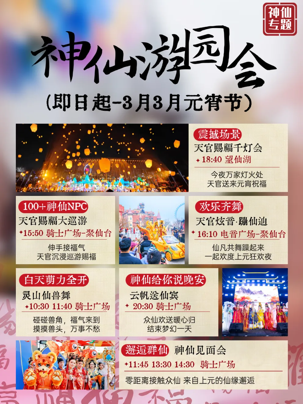 今年元宵,济南融创文旅城的“神仙们”集体奉旨下凡啦!欢迎来到仙界团建现场,天官赐福千灯会、天官赐福大巡游、灵山仙兽舞等演艺活动轮番上演!