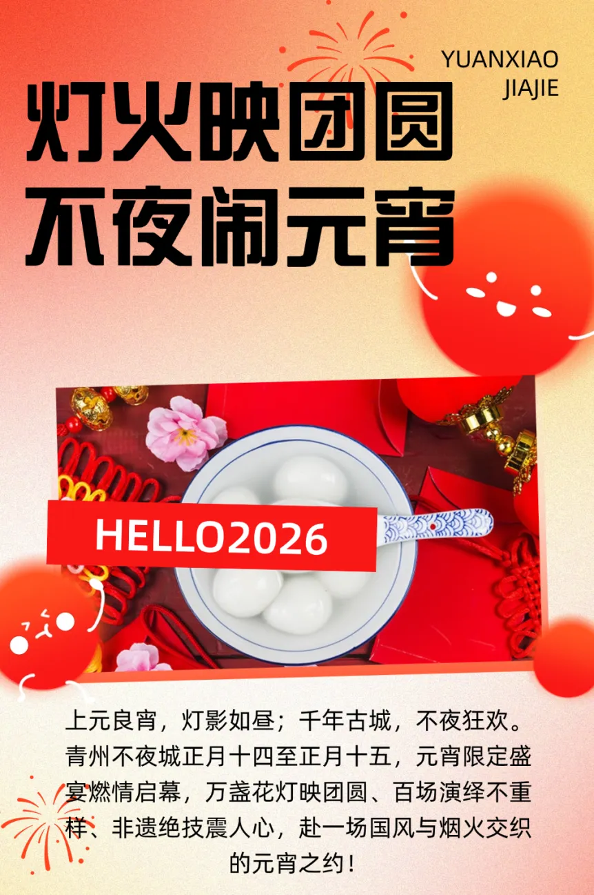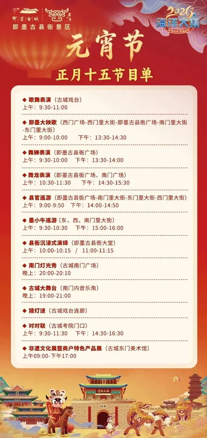来即墨古城闹元宵,逛新春庙会、赏绚丽灯会,看歌舞表演、尝特色美食、猜趣味灯谜、对妙趣对联、淘非遗好物,还有舞龙舞狮、古风巡游、灯光秀等精彩演绎轮番上演,承包您所有的节日仪式感,让团圆与欢喜撞个满怀。