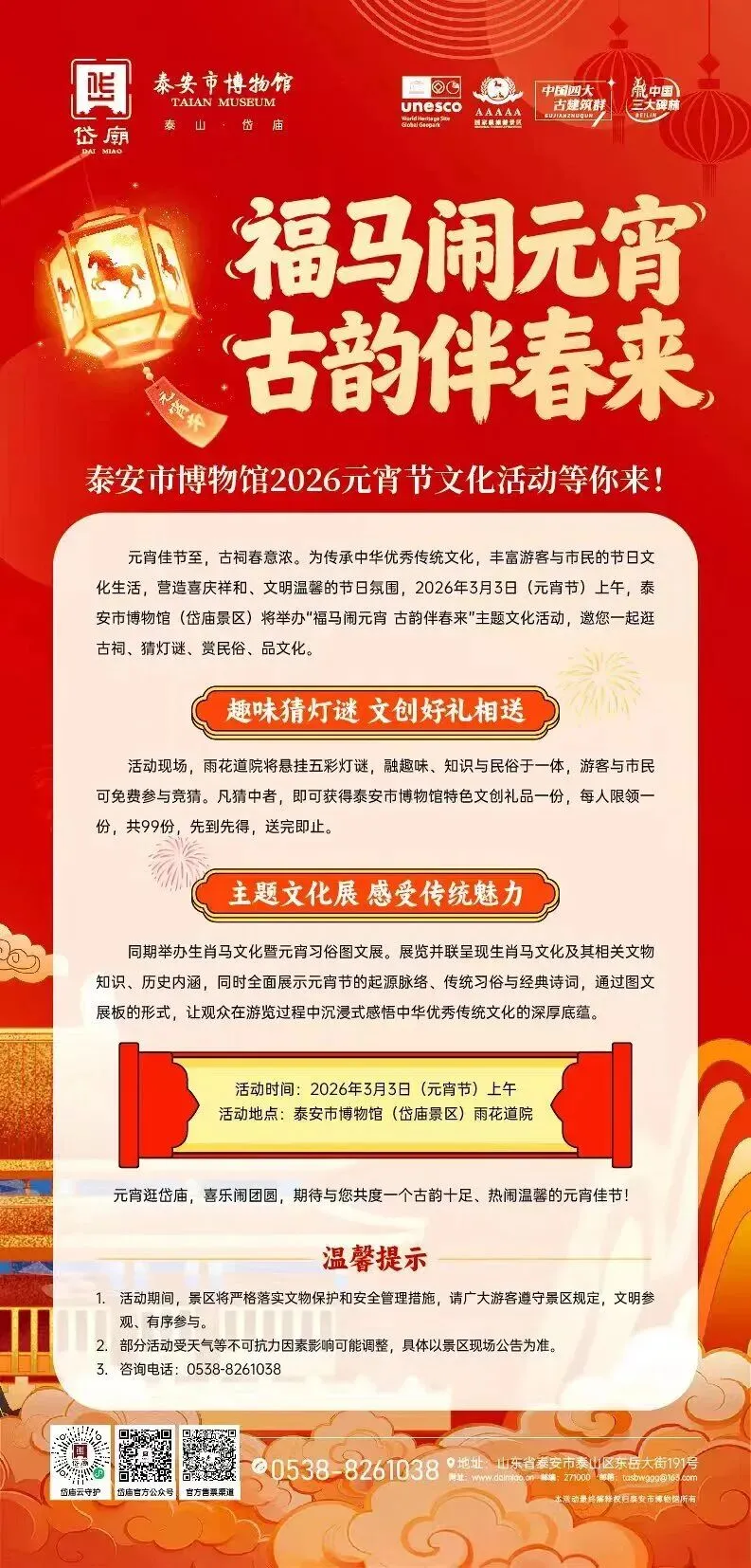 元宵节当天泰安市博物馆(岱庙景区)将举办“福马闹元宵 古韵伴春来”主题文化活动,邀您一起逛古祠、猜灯谜、赏民俗、品文化,过一个古韵十足、热闹温馨的元宵佳节!
