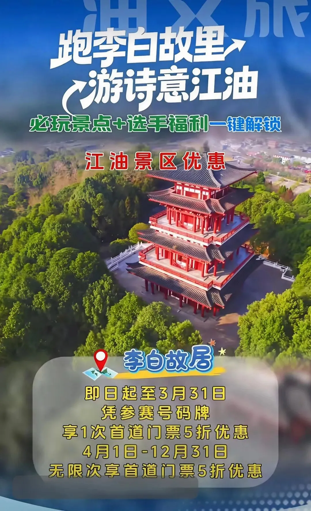 李白故居景区:即日起至3月31日,凭参赛号码牌享首道门票五折优惠,仅限一次;4月1日至12月31日,凭本人实名参赛信息,可无限次享首道门票五折优惠。