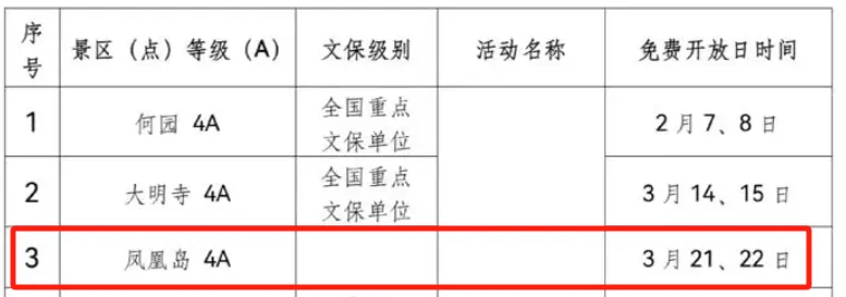 扬州3月只有凤凰岛免费开放,大明寺原定于3月14、15日,后调整为9月5日、6日。