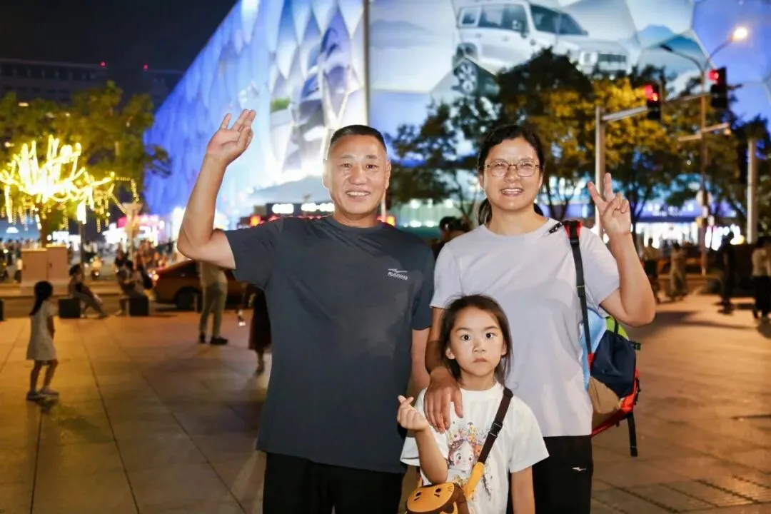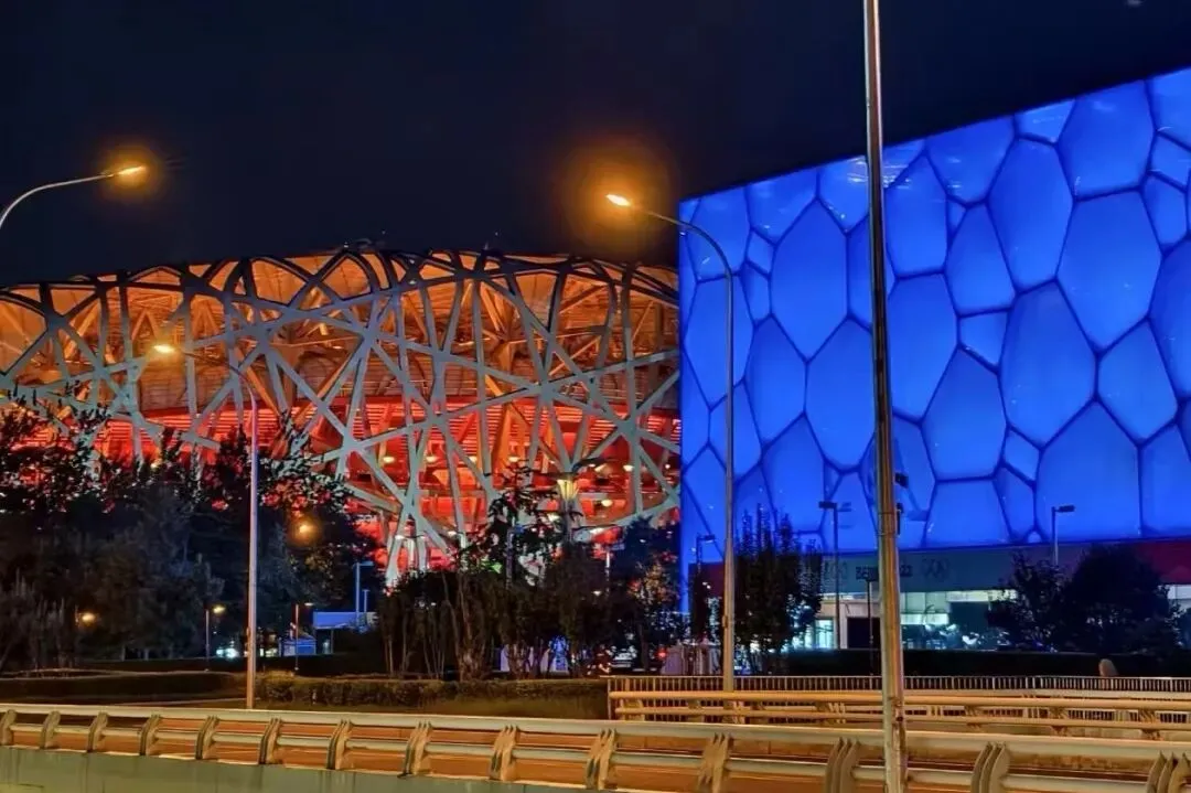 奥林匹克公园内,鸟巢焕发炽烈红光,水立方则泛起幽蓝波纹。站在奥海中轴线上,沉浸于“冰火相交”的视觉对比,2008奥运的热血与感动恍如昨日。