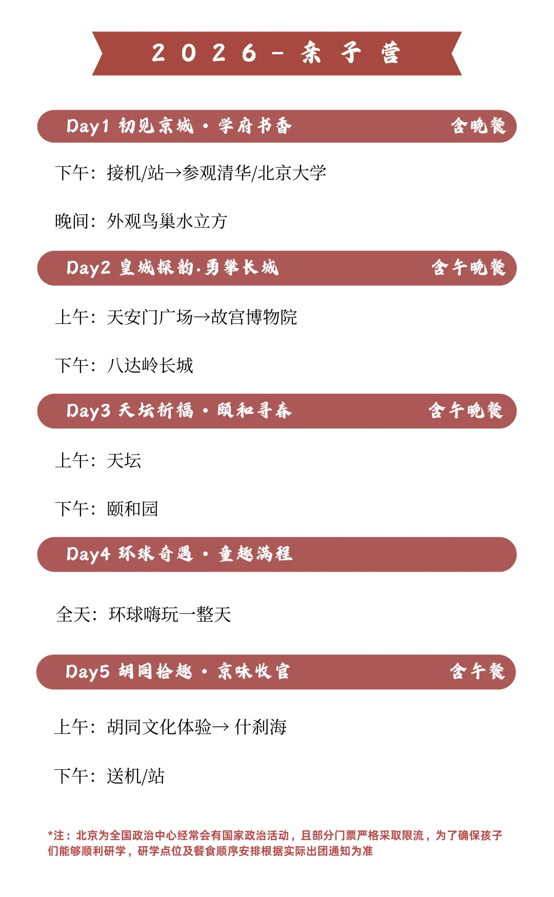 门票及体验:故宫、天坛、颐和园、清华/北京大学校园参观、胡同文化体验(听蛐蛐、观老物什)、八达岭长城、环球度假区 1日门票。