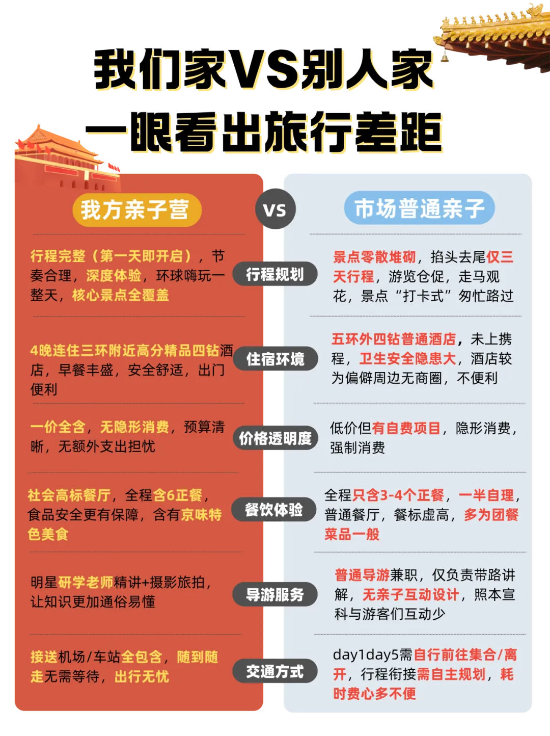 针对北京热门景点限流措施,我们将尽可能提前预约票务,全力保障出票,但还是存在部分热门场馆抢票失败的可能性,如遇旺季故宫门票无法保证,将优先保障儿童入园;成人则每人退订 200 元,并调整行程为游览景山公园,以俯瞰故宫全景,敬请谅解。
