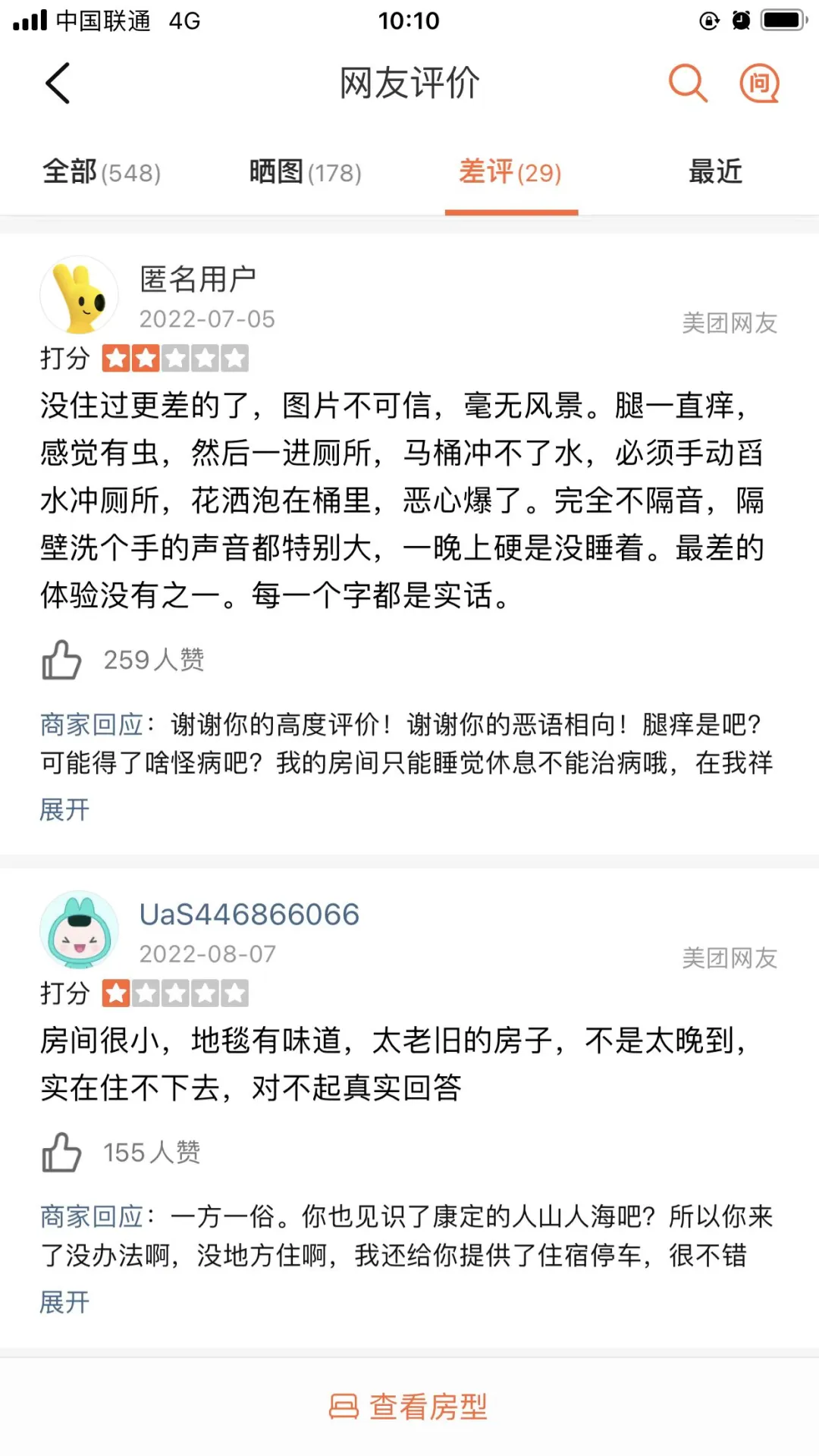 网友给了这家店差评后,商家不仅在他给的差评下讽刺他“没钱别来康定玩”,还疑似因为理亏转而用小号继续进行辱骂。 记者搜索发现,该酒店几乎回复了每一条差评,但态度大都很差。比如顾客评论入住之后“腿一直痒,感觉有虫”,商家回复“腿痒是吧?可能是得了啥怪病吧?”,再比如,有人吐槽房间设施不好,商家则称“我们康定人太多,有地方给你住就是你上辈子了烧高香”。 网友称,他订房那天,该酒店在美团上的评分竟然高达4.8。2月27日,记者再查看的时候,该酒店的评分已经降到3.7分。