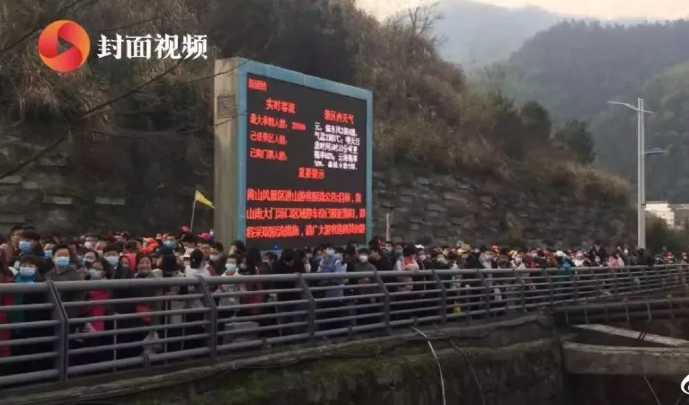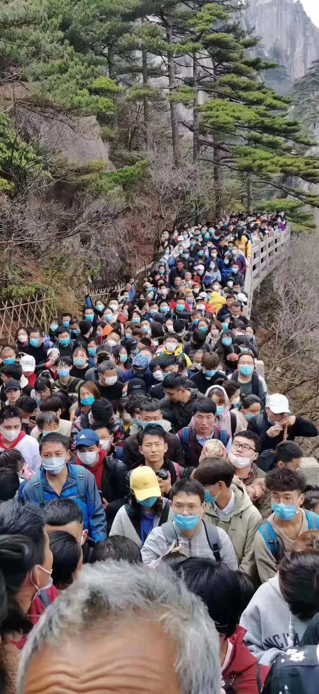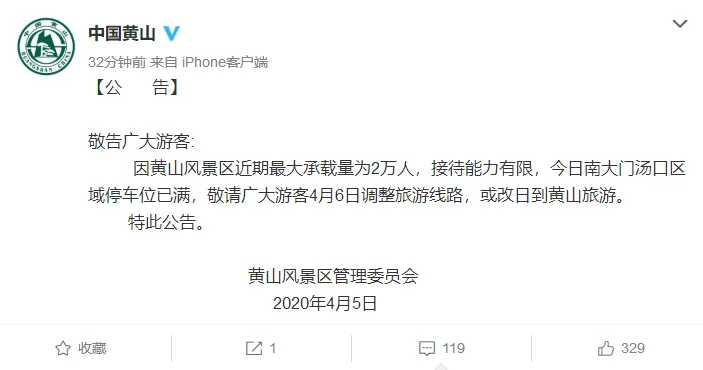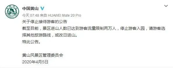 戳现场视频↓ 上午7时48分,@中国黄山 发布关于停止接待游客的公告: 截至目前,景区进山人数已达到游客流量限制两万人,停止游客入园,请游客选择其他旅游路线,或改日进山。 特此公告。 黄山风景区管理委员会 2020年4月5日 上午10时42分,@中国黄山 再发公告: 敬告广大游客: 因黄山风景区近期最大承载量为2万人,接待能力有限,今日南大门汤口区域停车位已满,敬请广大游客4月6日调整旅游线路,或改日到黄山旅游。