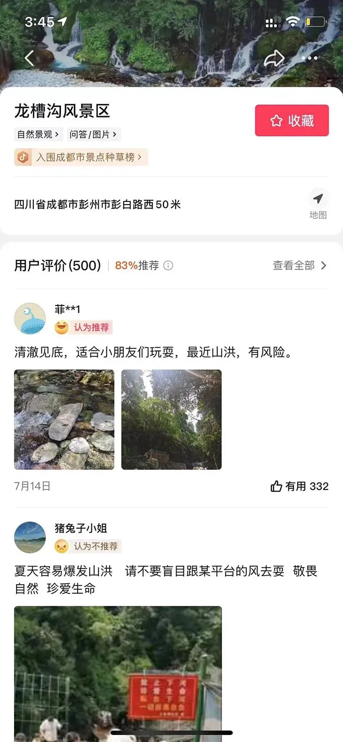 14日下午,高德地图一名工作人员就此回应澎湃新闻称,经核实龙槽沟景区资质,该地不属于景区,现在已经在高德地图上将该地点删除。如何确定景区资质认证是由专门的工作人员负责,他们不清楚也无法透露。 抖音平台用户推荐评价 14日15时许,在抖音搜索栏中输入“龙漕沟”关键词,仍然能搜索到“龙漕沟风景区”的地点信息,并且标明该景点入围了“成都市景点种草榜”。点进地点后,可以看到具体位置标识,及用户留下的500条评价,其中83%均为好评。 抖音地点信息,事发地被标注入围“成都市景点种草榜”。 在该地点标签下的有视频展示了事发前的龙漕沟旅游状况。视频内容显示,沟内游客众多,许多游客在河岸两侧搭起帐篷,还有小孩进入河床玩耍嬉戏。记者就平台内大量推荐游玩的体验视频一事致电了抖音官方客服,对方表示只能对当前未删除、仍能检索到的违规内容进行举报,面对记者提到的情况,他们也无法核实。