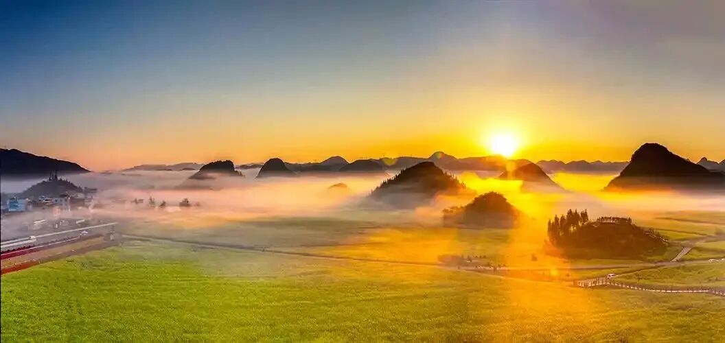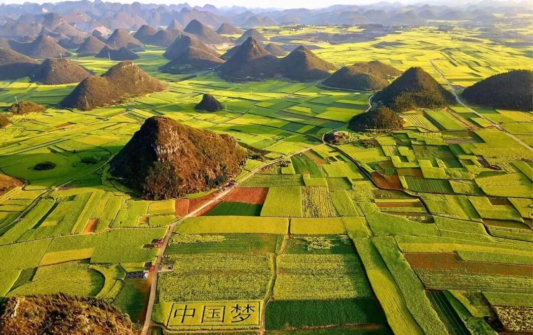 喀斯特小山锥错落在百万亩花田里,像 “金色海洋中的岛屿”,《吉尼斯世界纪录》认证的 “世界最大自然花园” 核心区