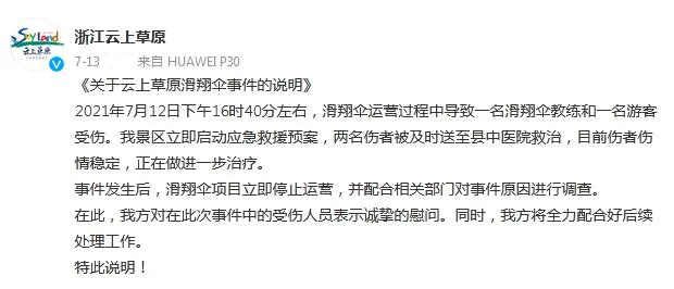现场受伤游客怎么样了? 浙江云上草原高山 四季旅游度假区官方微博 @浙江云上草原 刚刚发布关于 云上草原滑翔伞事件的说明 ↓
