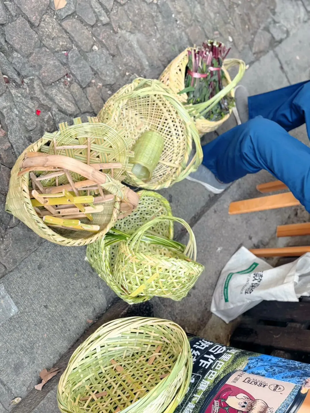 镇口,古镇的居民摆着小摊,卖着他们自己手工编制的竹器,要价通常只在十来块钱,生意倒还不错。