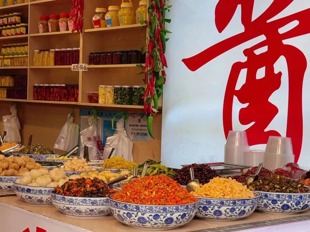这里有卖各种吃食的,麻花、蜜饯、栗子酥、酱料……各式各样的吃食都有。