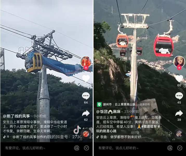 7月12日,浙江湖州安吉县云上草原景区发生一起事故,有滑翔伞与缆车相撞致人坠落。