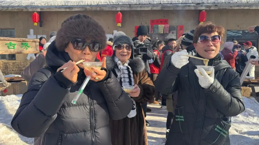 一踏入透龙山景区,游客们就被景区精心准备的秧歌表演欢迎仪式所吸引,游客们有的与景区秧歌队共同起舞,有的驻足玫瑰冰墙等打卡地拍照,一片热情洋溢的欢乐景象。大家还来到青山不墨实景拍摄基地门前,品尝独具东北特色风味的铁锅烩酸菜,在透龙山森林大厨房露天烤炉旁,津津有味地品尝烤地瓜,烤鸡蛋等东北特色小吃,回味无穷。饱餐后大家与美景拍照留念、雪地撒欢儿,玩得不亦乐乎。在伐木生产大会战体验区,大家聆听景区讲解员讲述林业英雄马永顺的故事,感受东北老一辈林区工人的奉献精神。