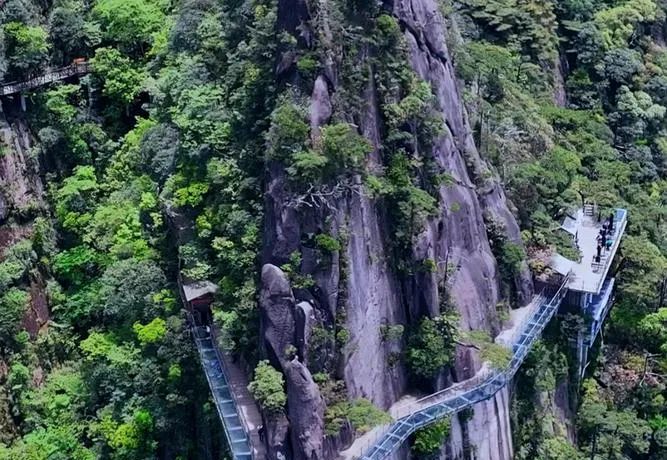 三清山的名气比怀玉山大得多,但有个很奇怪的现象,去过三清山的人都说好看,但很少有人能说清楚它好看在哪,大部分人只能说"石头很奇特""云海很壮观",这些都对,但都浅了,因为三清山真正让人震撼的不是某个具体的景观,而是它把"险"和"秀"这两个本来矛盾的东西完美地融在了一起。你站在栈道上往下看,底下是深不见底的峡谷,往上看是垂直的峭壁,这种地形按理说应该给人一种压迫感,但三清山不会,因为那些峭壁和峰林的轮廓线太柔和了,像是被水流冲刷过无数遍,所有的棱角都磨圆了,所以你在那里感受到的不是"征服自然"的豪迈,而是一种"与自然共处"的平静。