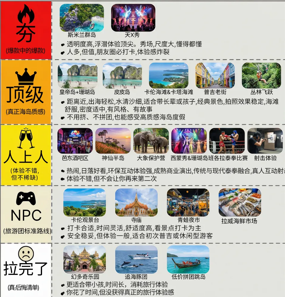 NPC段位核心:安全稳妥,但体验一般,适合初次普吉或休闲型游客。