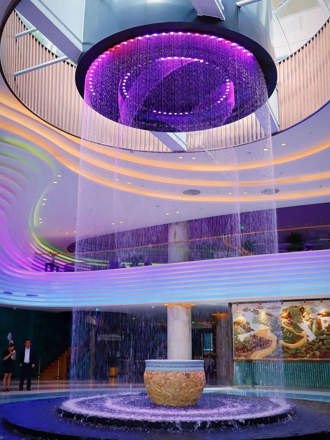 步入大堂,映入眼帘的是点线面与光与影的自然艺术融合,简约又不失高级感的气质迎面而来。大堂中间的水帘光影,随着音乐节奏呈现多彩的动画。