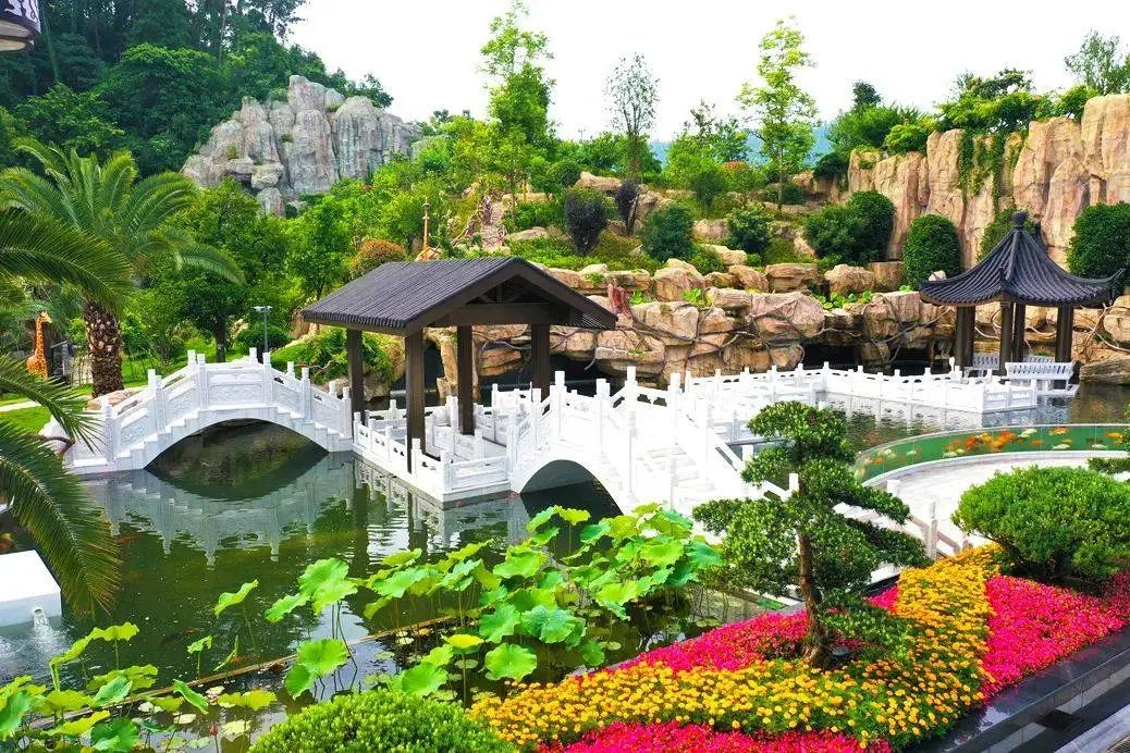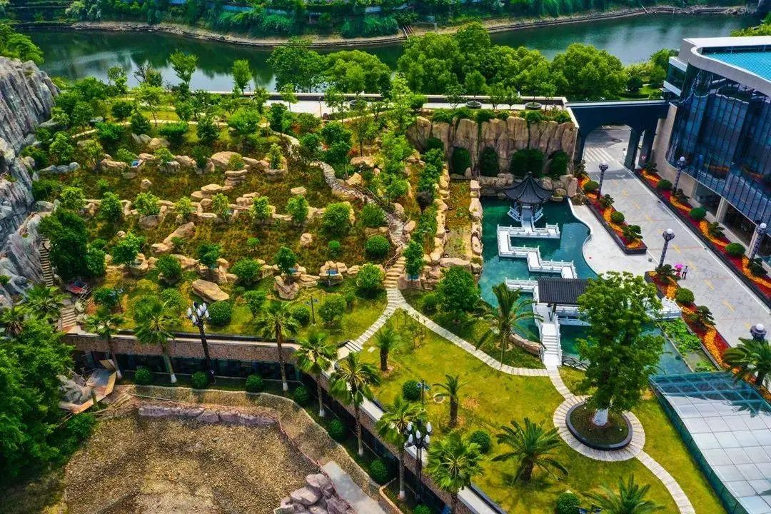 九曲白玉桥连接着花果山,景色秀丽,沿着小路蜿蜒而上,山色郁郁葱葱,上面种植有48种浙江水果,成熟季节可搭配亲子采摘,与锦鲤喂食共同成为酒店亲子体验点。