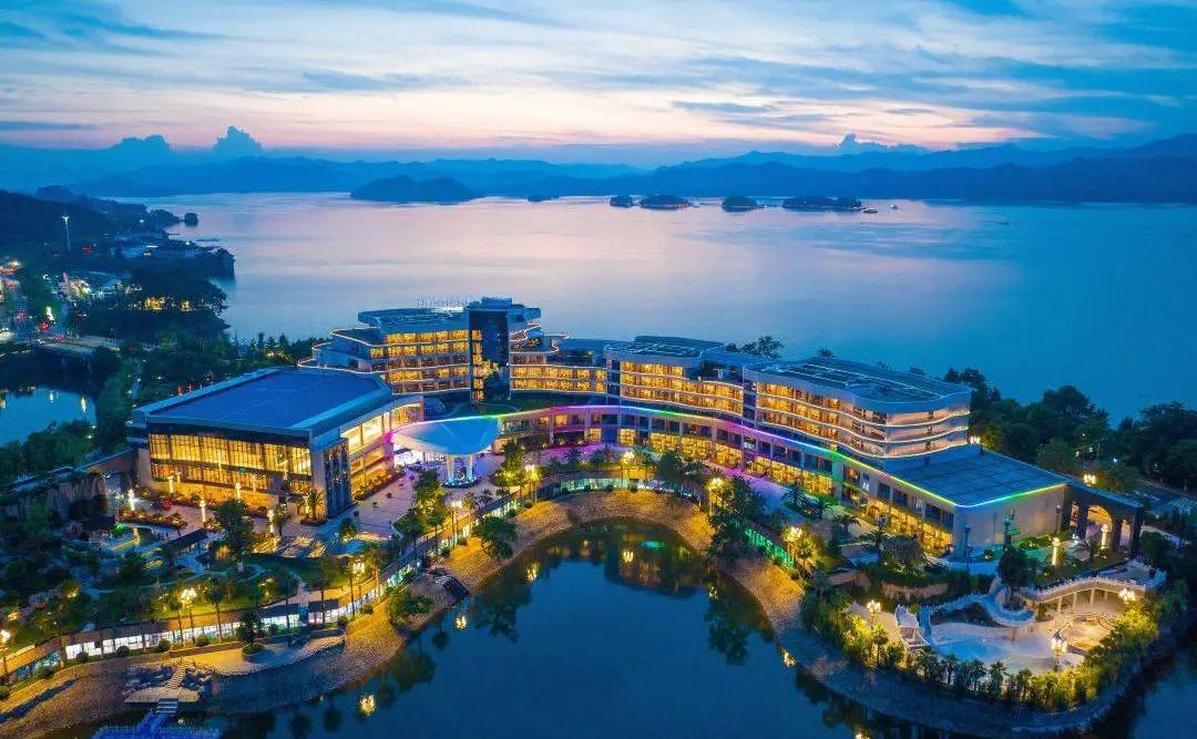 酒店选址秀水桥西南,紧邻梦姑路,独占半岛,坐拥商业街区,三面临湖,置身酒店就可饱览层峦叠翠的千岛风光。同时也是集网红打卡、亲子遛娃、大型会议会展为一体的综合性度假酒店。
