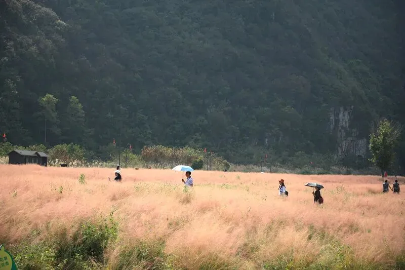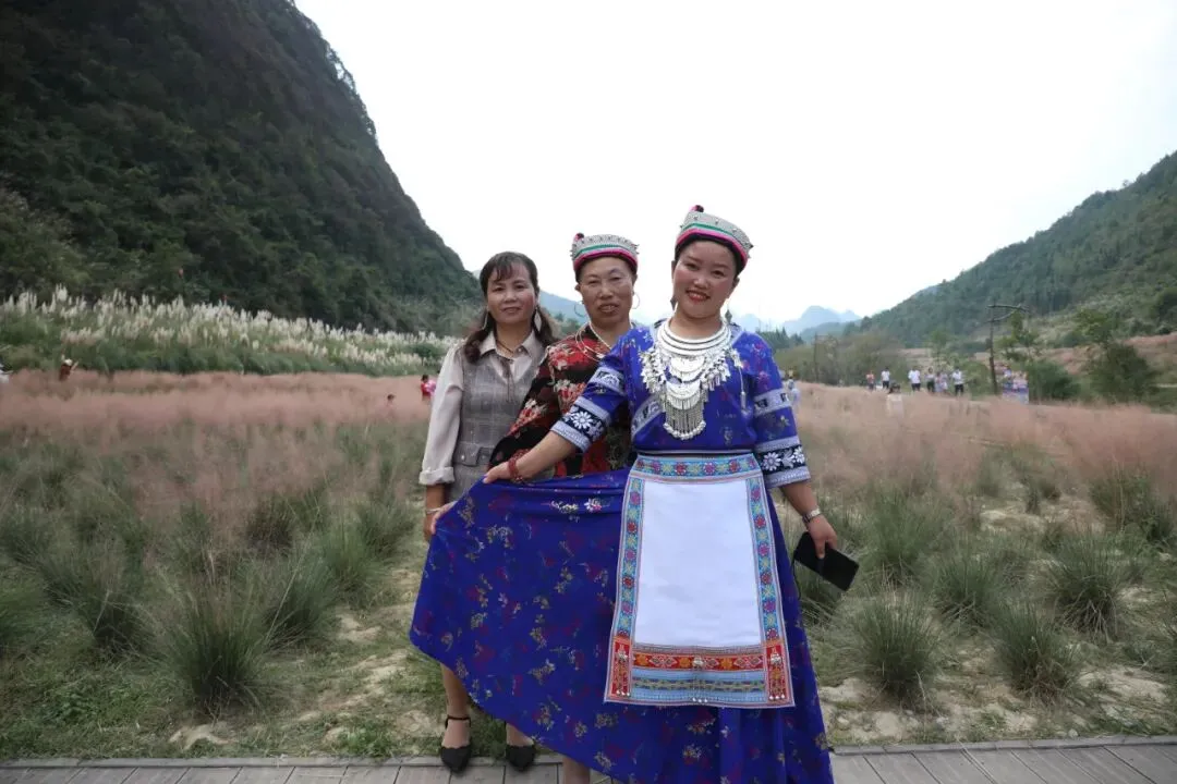 “我们是从安顺来的,从抖音上看到的,这里风景还可以,之前一直都在上班没有时间来,今天国庆最后一天,我们就开车过来玩,下次有机会一定还会来。”来自安顺的游客杨小海穿着自家的少数民族服饰,在粉黛乱子草景点一边拍照一边说道。