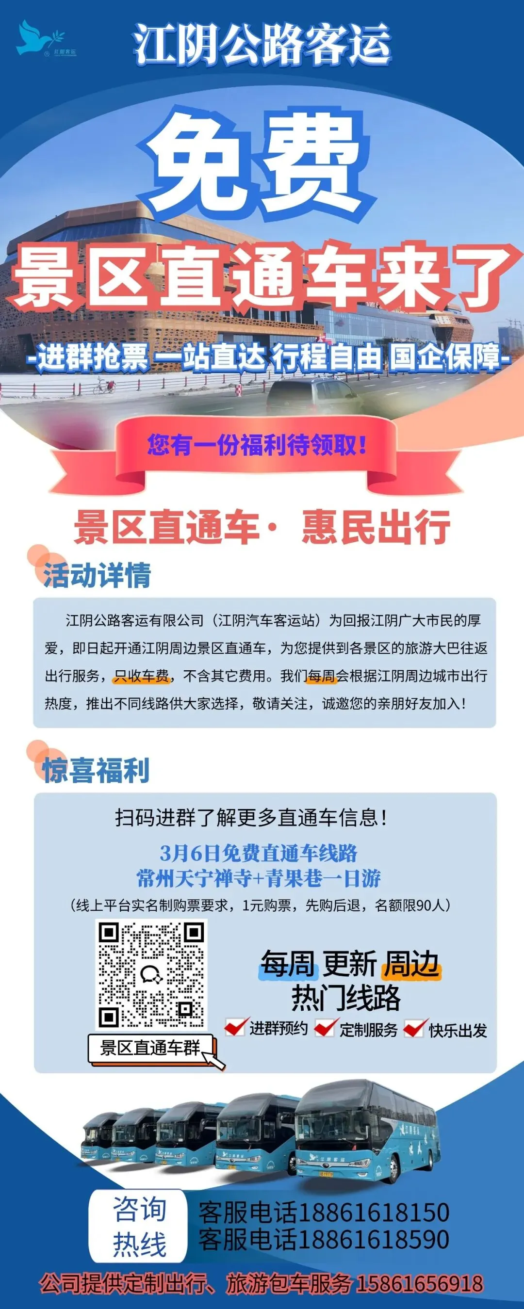 扫描上方二维码,加入“江阴客运景区直通车”社群,每月路线群内提前更新,如有其他疑惑也可以在群里咨询客服。