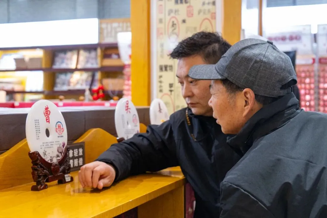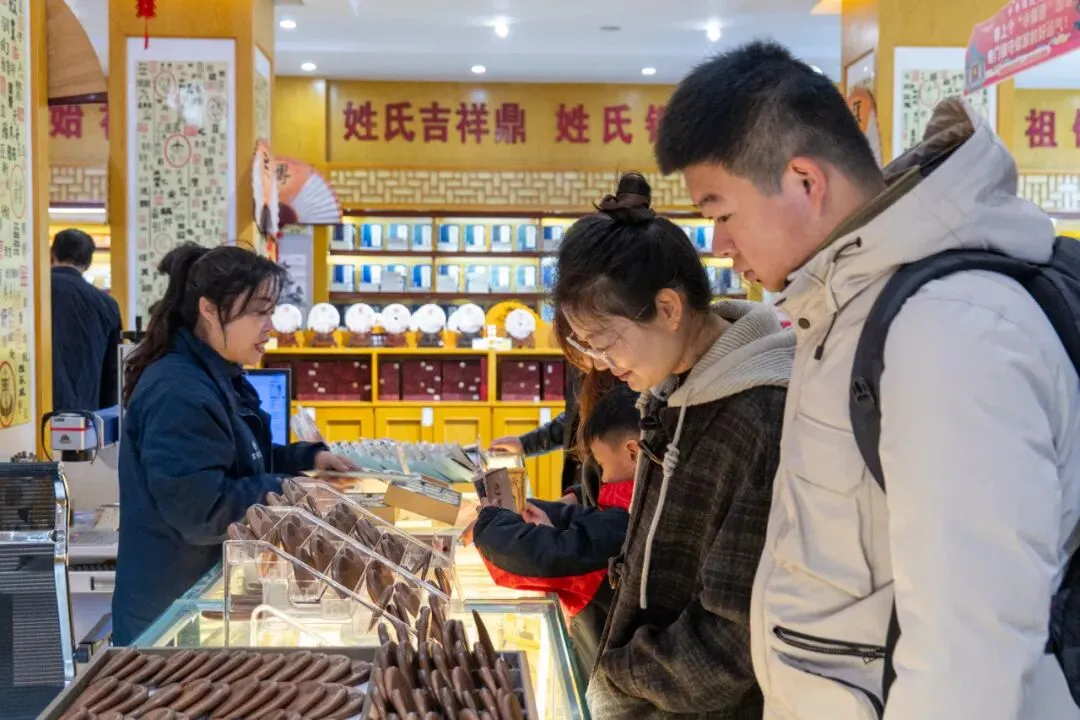 中华姓氏苑内,不少移民后裔家翻看着景区文创产品“家谱”,他们大多是从家谱咨询交流中心过来的,在那里翻看了很多老家谱,也想为自己家续上一本,经过工作人员的详细介绍,来自山东青岛的王女士爽快的下了单。