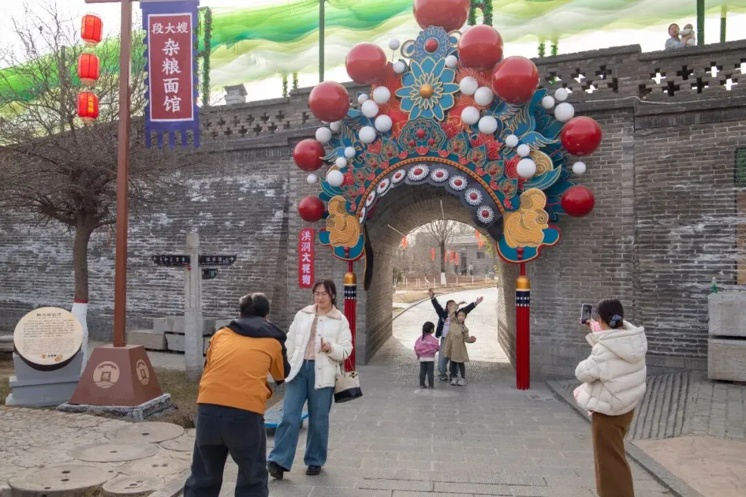 在“大明·槐树庄”,一群年轻游客在沉浸式市井体验中拍照打卡。青花瓷墙、醋院墙等国潮打卡点前,年轻游客排起长队;桑梓路上的飘带路、标志性“山西”红墙则成为家庭合影的热门背景。而他们大多是来自太原、晋中、临汾等地的错峰游游客。“我们专门趁着假期结束过来,体验感很好,很多打卡点人都不多,很适合我们拍照。”来自临汾的宋女士还展示了一下他们的打卡作品,照片中一群年轻人活泼的摆着各种造型,脸上均是笑意。槐树里商业街区作为景区新晋亮点依旧活力满满。美食区里,刀削面、陈醋、炒凉粉的香气弥漫,娱乐场中孩子们欢声笑语增添春节热闹氛围。春节假期后,洪洞大槐树景区各类活动热度不减。