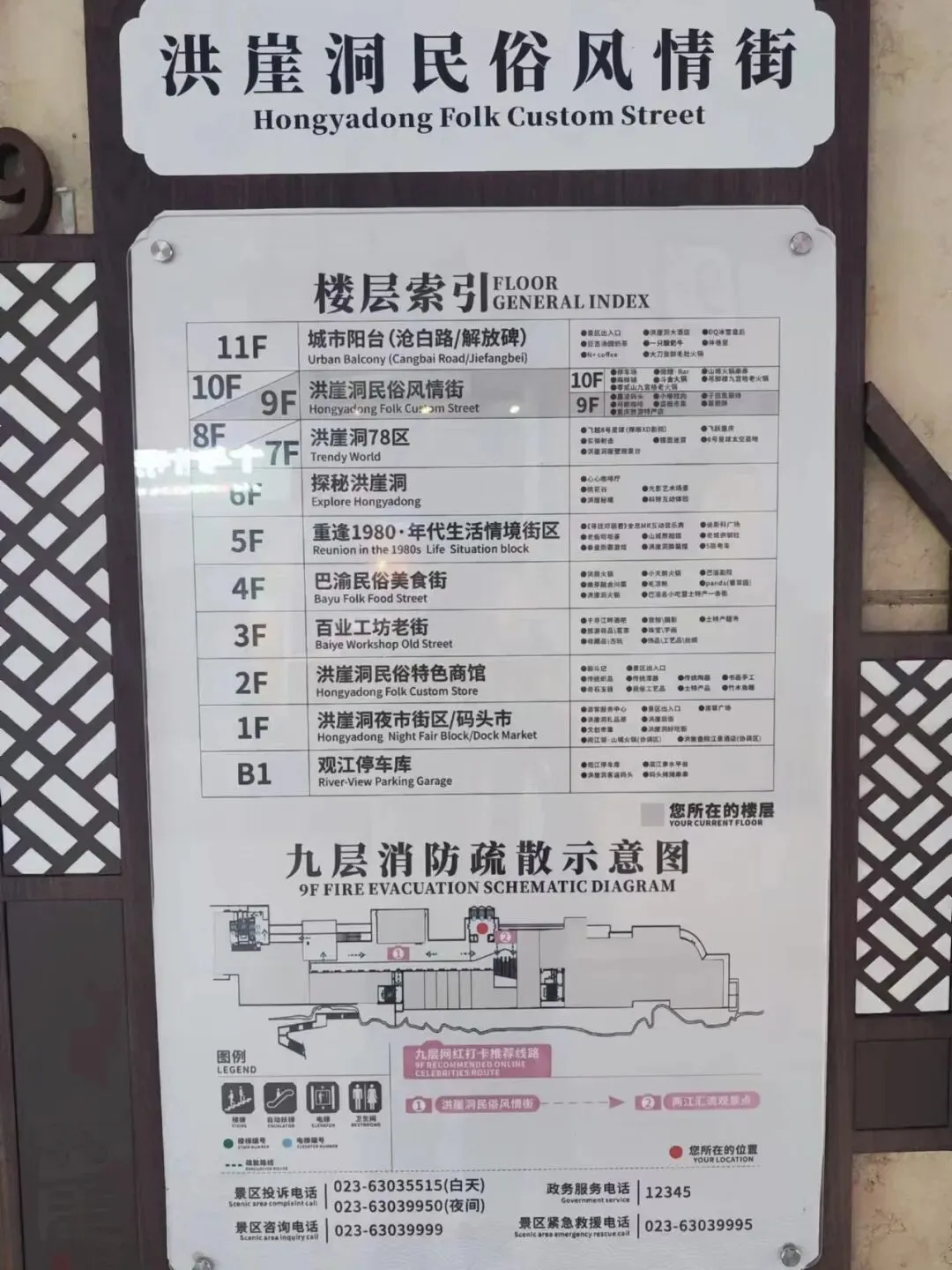 地形复杂,11层为山顶街面层,1层位于江边,多层均有出口通往不同街道(主要出入口位于11层、2层和1层)。
