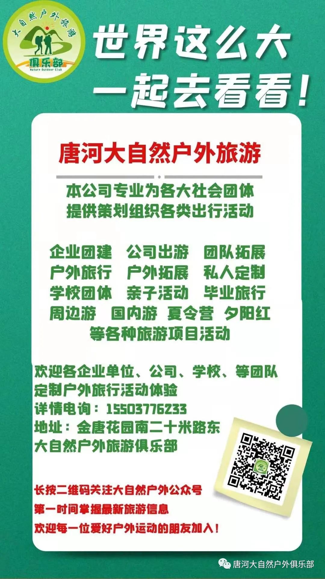 集合地址:唐河春秋国旅大自然户外旅游俱乐部【老红会医院往东第一个路口万达客栈往北那个道儿100米路东】【门牌--春秋国旅】