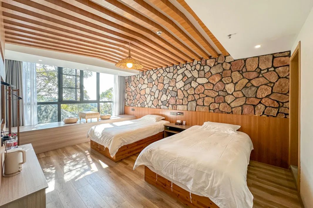 原木的典雅和石头的海味融合出别样的和谐与优雅,带给人许多怀旧的味道。民宿里的六个房间都经过了精心设计,开阔的院子、诸多的古木、满山的绿意,传达出舒心院落的一股股清意,让人感受到那份家的舒适、温馨和悠然。