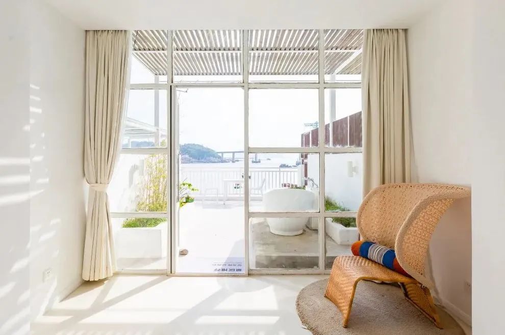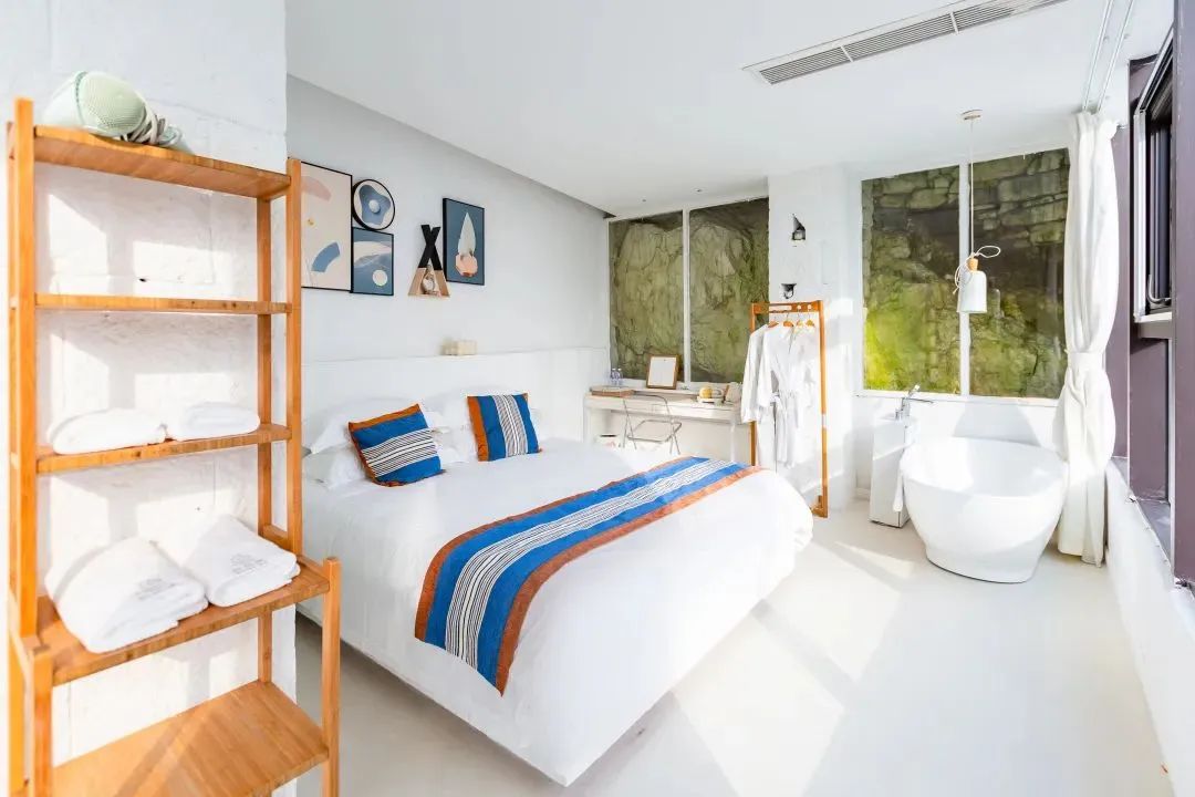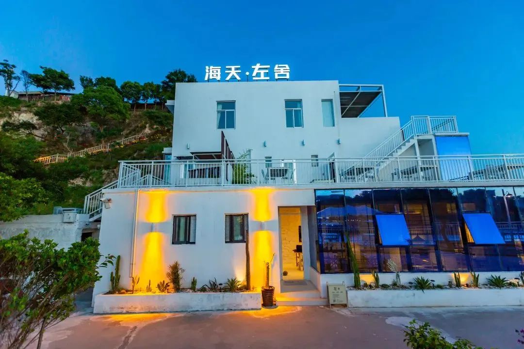 住在海天左舍,推窗望海,倚栏听风,蓝色落地玻璃窗、白色外立面、原生态石头墙,在蓝天碧海的映衬下,显得单纯而热烈。