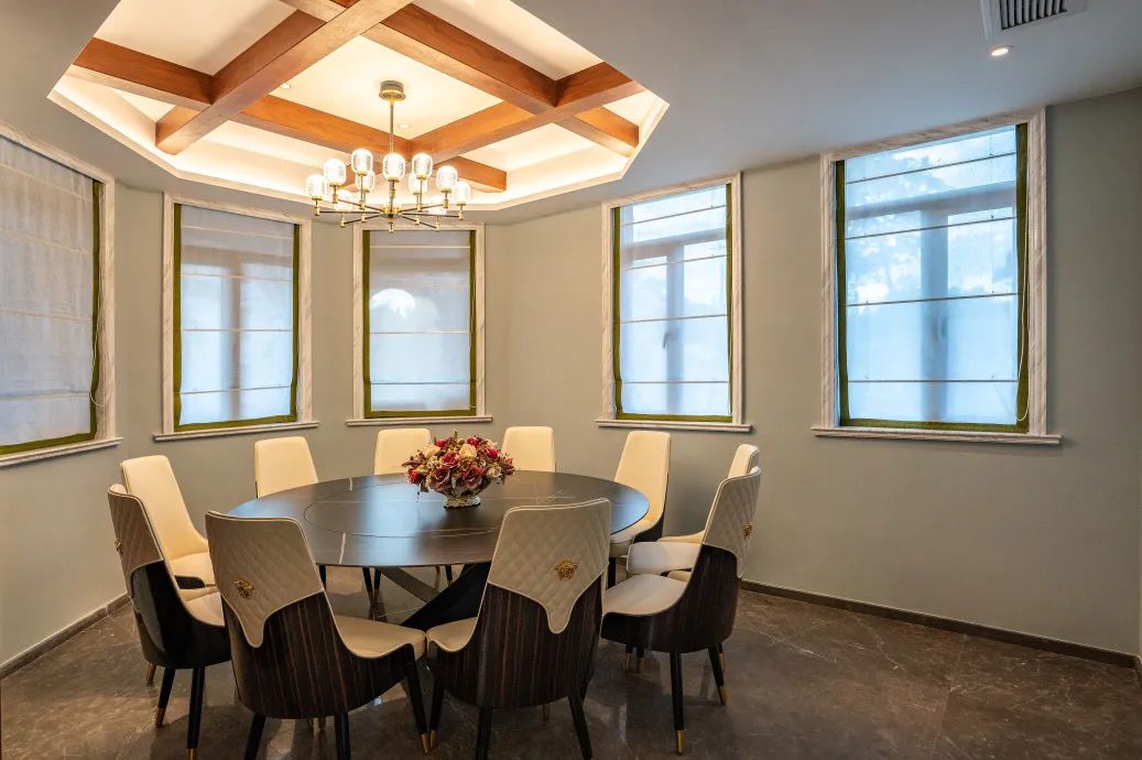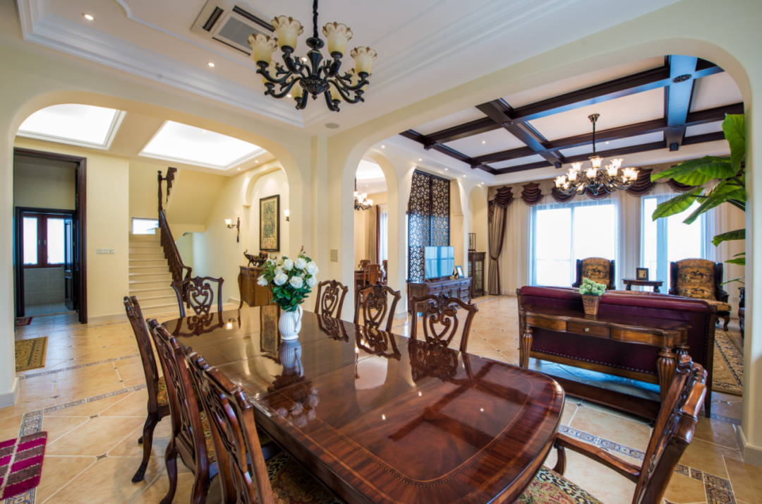 王里湾别墅有六个房间,都自带卫生间。有四个房间躺床上就能眺望大海,分别在顶层和负二层。餐厅有长桌和圆桌两种桌型,分别适用于西餐和中餐,别墅里还有面朝大海的大泳池,特别适合朋友聚会、开各种派对。